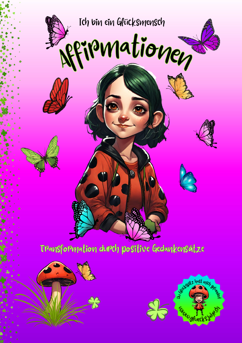 Eine Anleitung mit Affirmationen zum Glücklich sein, mit fröhlichen Bildern. Freue dich auf deine Verwandlung!